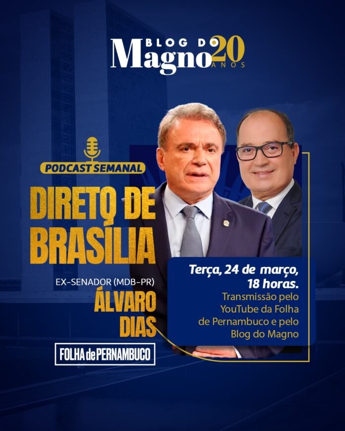 O ex-senador Álvaro Dias, agora membro do MDB do Paraná, será o entrevistado do podcast ‘Direto de Brasília’, uma iniciativa em colaboração com a Folha de Pernambuco, programado para hoje. Durante a conversa, ele abordará temas relevantes como os escândalos relacionados ao Banco Master e ao INSS, além de discutir a sucessão presidencial e suas perspectivas políticas futuras, incluindo a possibilidade de uma nova candidatura ao Senado ou à Câmara dos Deputados.