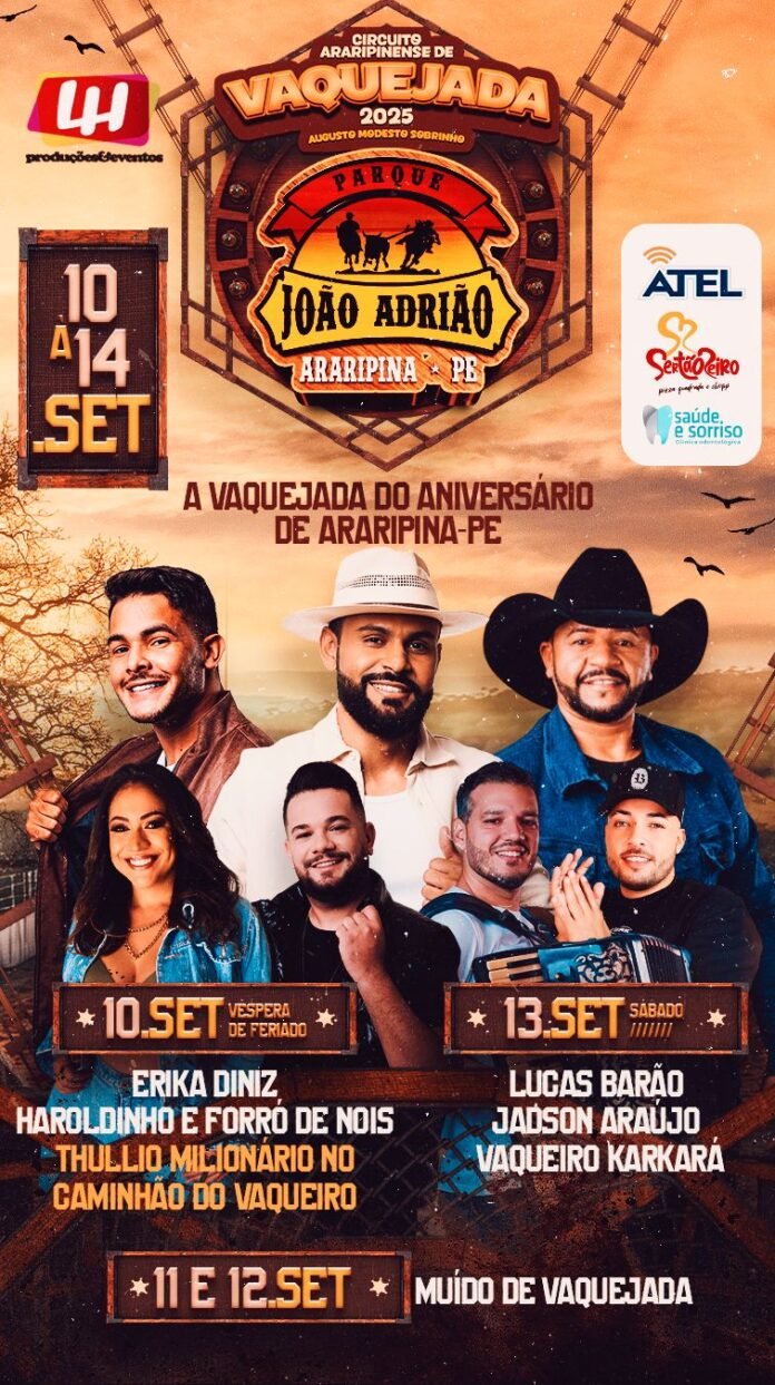 RARIPINA, PE — O calendário cultural de Araripina ganha um destaque especial em setembro com a realização do Circuito Araripinense de Vaquejada. O evento, que faz parte das comemorações de aniversário da cidade, acontece no Parque João Adrião de 10 a 14 de setembro e promete atrair milhares de pessoas com uma programação repleta de competições e shows de forró e vaquejada.