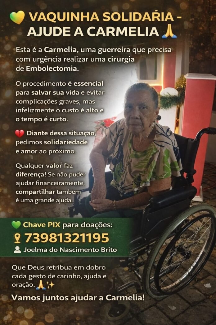 Dona Carmelia foi diagnosticada com a necessidade urgente de uma embolectomia — um procedimento cirúrgico para a remoção de um êmbolo (coágulo) que bloqueia a circulação sanguínea. Segundo familiares, a cirurgia é essencial não apenas para evitar complicações graves e sequelas irreversíveis, mas para garantir a sobrevivência da idosa.
