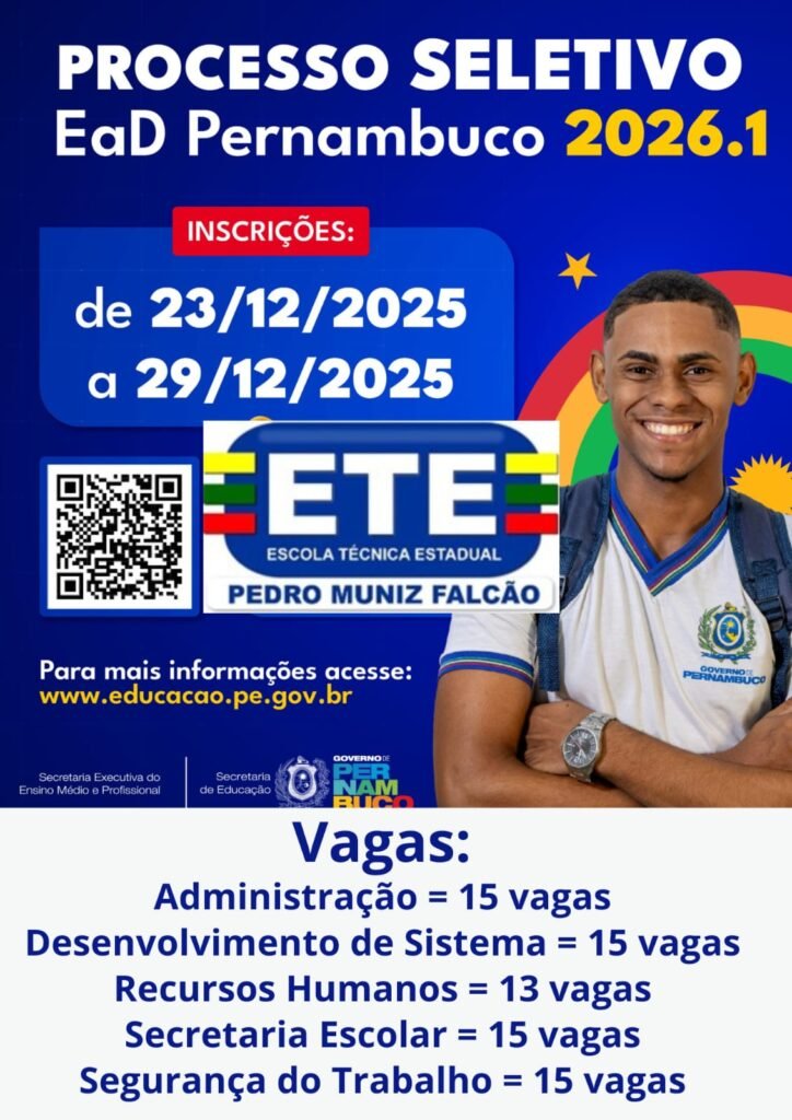 ​A Escola Técnica Estadual (ETE) Pedro Muniz Falcão, localizada em Araripina, está com as inscrições abertas para o processo seletivo de diversos Cursos Técnicos, na modalidade EDUCAÇÃO A DISTÂNCIA (EAD) oferecendo uma excelente oportunidade para quem busca qualificação profissional de nível médio.