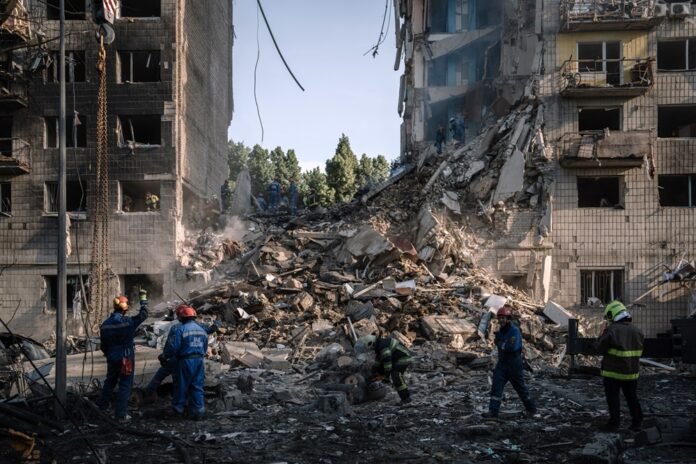 Equipes de resgate buscam vítimas sob os escombros após um ataque aéreo a um prédio residenci...