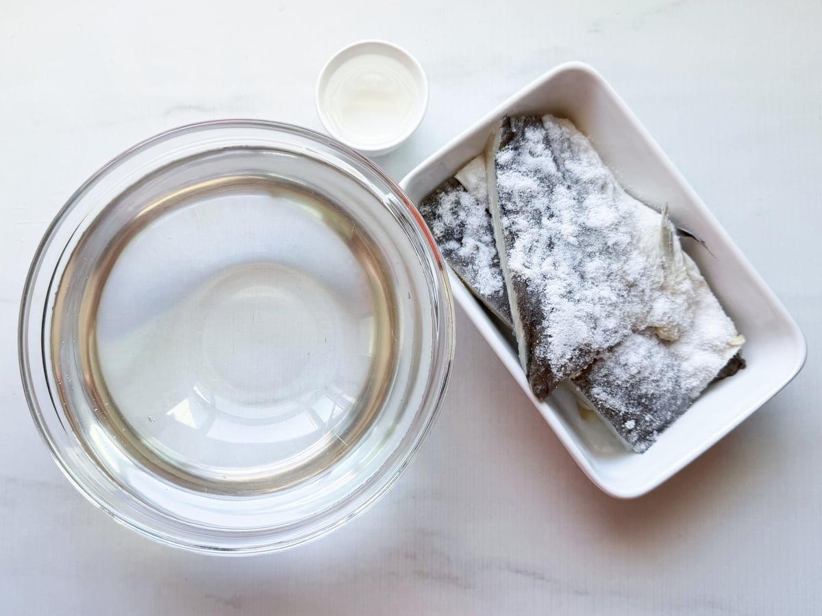 Antes de começar, organize os ingredientes na bancada: 500 gramas de bacalhau, 4 litros de água e 4 colheres de sopa de vinagre de álcool. Ter tudo à mão facilita o processo e evita imprevistos.