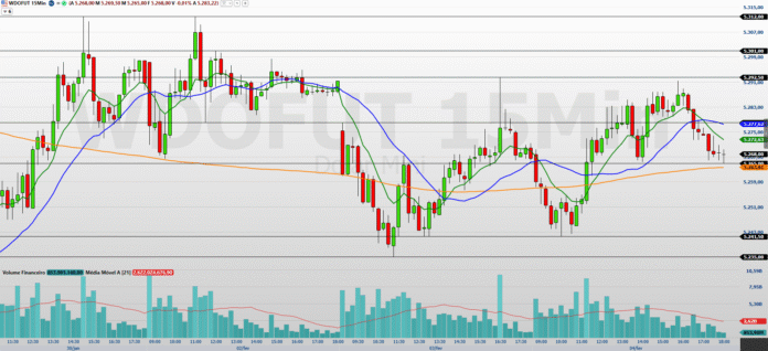 No gráfico de 15 minutos, o minidólar apresentou um fechamento levemente positivo, embora ainda abaixo das médias móveis de 9 e 21 períodos. Esse posicionamento sugere uma dificuldade em sustentar uma alta consistente. Para que o ativo consiga ganhar tração, é crucial que haja um aumento significativo no volume de negociações, rompendo as resistências situadas entre 5.277,5 e 5.292,5 pontos. Caso essa faixa seja superada, o mercado poderá buscar novos patamares em torno de 5.301 a 5.312 pontos.