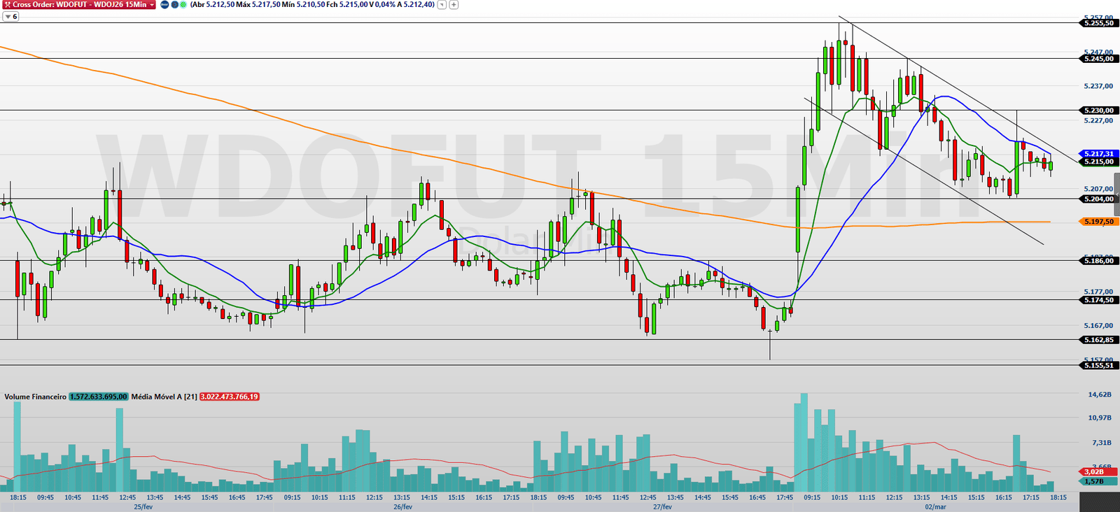 No gráfico de 15 minutos, o minidólar mostrou uma leve recuperação, negociando entre as médias móveis de 9 e 21 períodos. Para que essa tendência de alta se solidifique, é crucial que o contrato consiga superar a resistência localizada entre 5.230 e 5.245 pontos. Um rompimento bem-sucedido pode abrir caminho para uma nova valorização, com projeções de alta até 5.255,5, 5.271,5 e, potencialmente, 5.288 a 5.309,5 pontos.