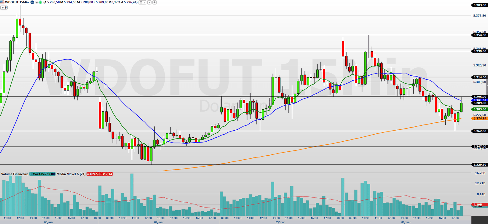 No gráfico de 15 minutos, o minidólar demonstrou um fechamento em baixa, indicando um movimento corretivo após os recentes avanços. O ativo apresentou oscilações entre as médias móveis de 9 e 21 períodos, sinalizando uma fase de indefinição no curto prazo. Para que o ativo recupere a força compradora, será crucial que haja um volume capaz de romper a resistência estabelecida entre 5.295 e 5.314 pontos.
