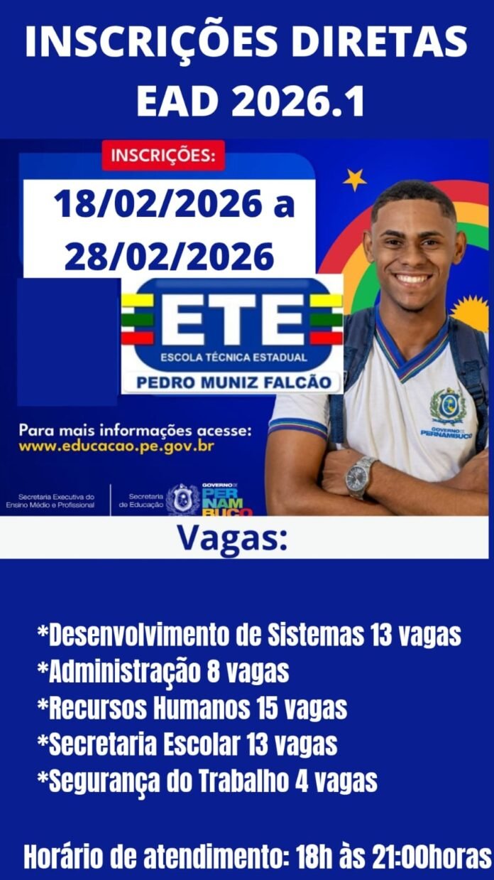 A Escola Técnica Estadual (ETE) Pedro Muniz Falcão anunciou a abertura do período de inscrições diretas para o semestre 2026.1 na modalidade de Ensino a Distância (EAD). Candidatos interessados em ingressar no ensino técnico profissionalizante têm entre os dias 18 e 28 de fevereiro para garantir uma vaga.