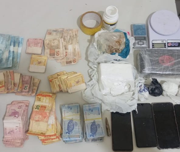 Durante a busca no local, os agentes encontraram diversos itens que levantaram suspeitas sobre o envolvimento dos detidos em outros delitos. Entre os produtos apreendidos estavam duas balanças de precisão, uma munição de calibre 7.62, R$ 5.965 em dinheiro, além de quatro celulares, sendo um deles também com registro de furto. Adicionalmente, foram encontrados entorpecentes, incluindo crack e cocaína.