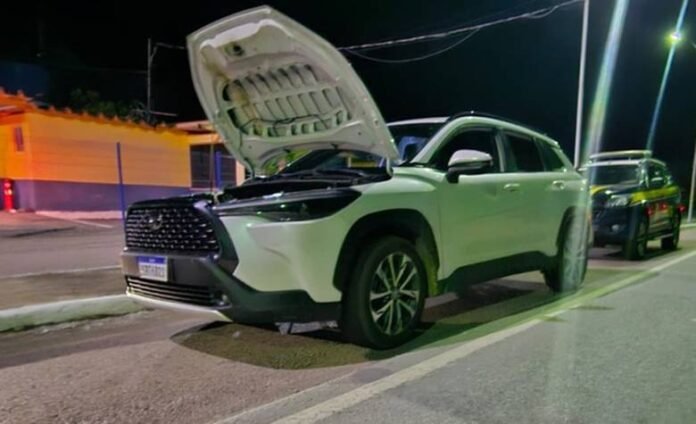 Por volta das 20h30, os agentes da PRF abordaram um Toyota/Corolla Cross XRE 20. Durante a abordagem, foram notados sinais de adulteração na placa do automóvel. Devido a essa suspeita, a equipe decidiu intensificar a verificação, realizando uma inspeção detalhada do veículo.