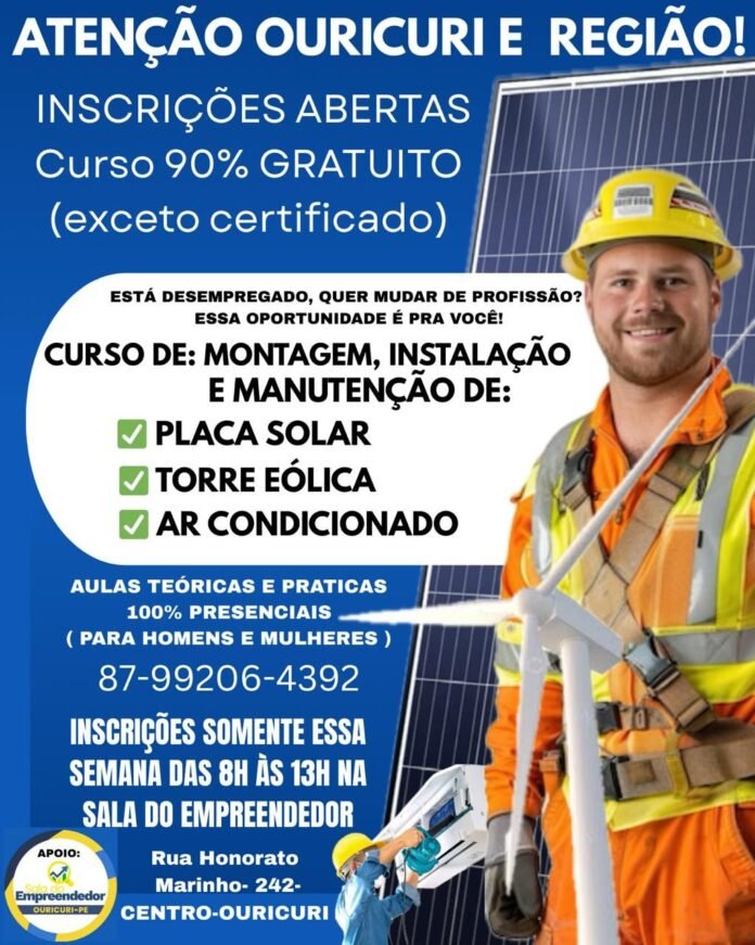 Se você está em busca de uma nova oportunidade profissional em um setor em crescimento, a sua chance chegou. Ouricuri, uma cidade com grande potencial para energias renováveis, está oferecendo cursos especializados em Montagem, Instalação e Manutenção de Placas Solares, Torres Eólicas e Sistemas de Ar-Condicionado. Com a demanda por profissionais qualificados aumentando, essa pode ser a mudança que você estava esperando.