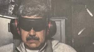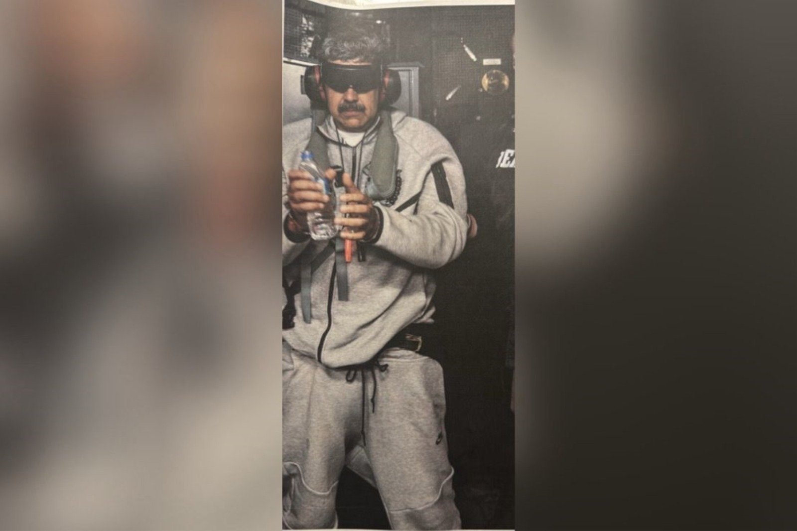 Na publicação, é possível ver Maduro algemado, segurando uma garrafa de água. O presidente venezuelano também utiliza fones de ouvido e venda nos olhos.