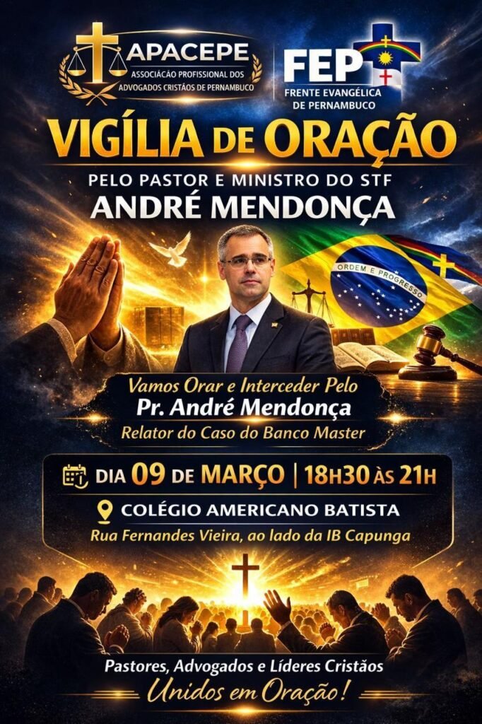 Uma vigília de oração em prol do ministro do Supremo Tribunal Federal, André Mendonça, está programada para a próxima segunda-feira, dia 9, na cidade do Recife. O evento, que visa unir a comunidade cristã em apoio ao magistrado, é promovido pela Associação Profissional dos Advogados Cristãos de Pernambuco (Apacepe) em parceria com a Frente Evangélica de Pernambuco (Fep).